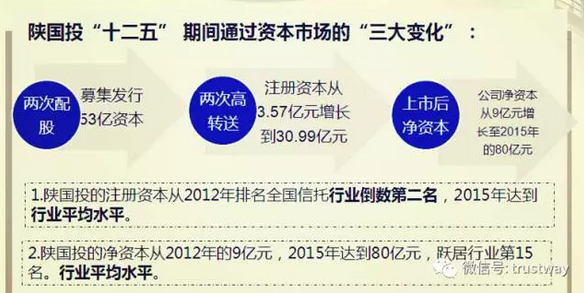 “2012年的時(shí)候,陜國投3.57億元的注冊(cè)資本在行業(yè)排名倒數(shù)第三?!毖久窀锌?,2015年,公司繼續(xù)把握住了資本市場階段性機(jī)會(huì),完成了“十二五”時(shí)期的第二次增資擴(kuò)股,募集資本32億元,再次實(shí)施十送十,使公司注冊(cè)資本達(dá)到了30.9億元,凈資產(chǎn)達(dá)到80億元,資本實(shí)力進(jìn)入行業(yè)第一梯隊(duì)。