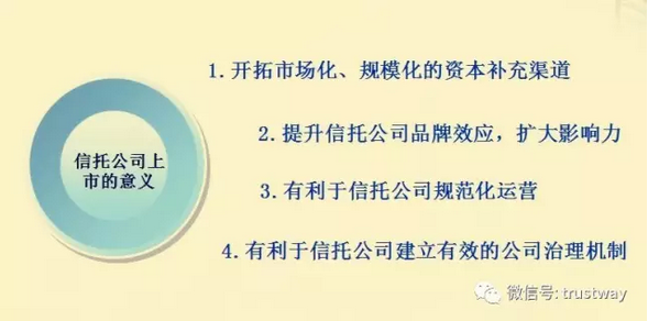 他認(rèn)為,對(duì)于信托公司來說,上市不僅可以為信托公司開拓市場化、規(guī)范化的資本充足渠道,還可以提升品牌效應(yīng)擴(kuò)大影響力,以及規(guī)范運(yùn)營和建立有效治理機(jī)制。
