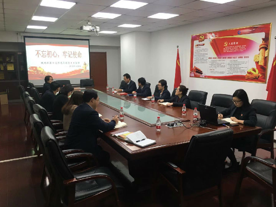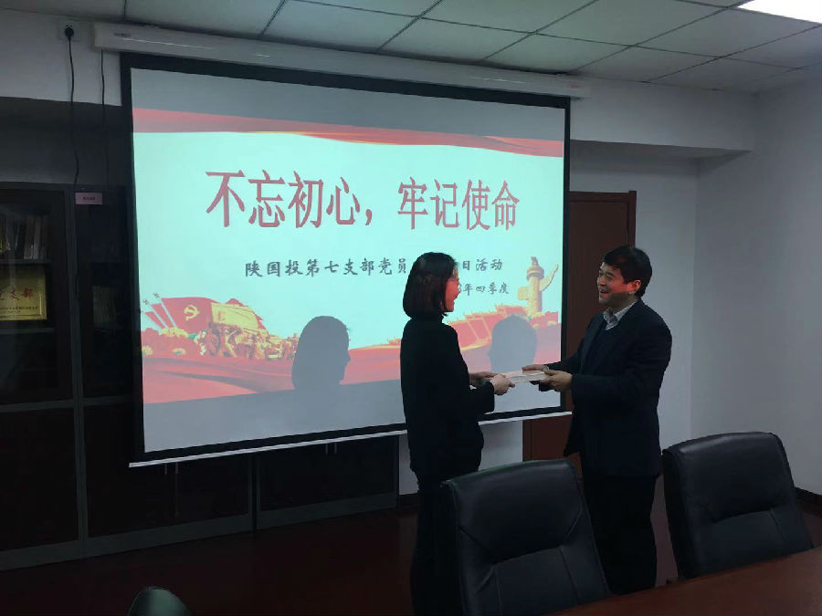 為認(rèn)真貫徹落實(shí)習(xí)近平新時(shí)代中國特色社會(huì)主義思想和黨的十九大精神,深入推進(jìn)全面從嚴(yán)治黨,進(jìn)一步創(chuàng)新“三會(huì)一課”內(nèi)容和形式,陜國投第七支部于2018年12月18日召開本年度第四季度黨支部大會(huì),舉行“不忘初心,牢記使命”黨員政治生日主題黨日活動(dòng)。公司副總裁王曉雁以普通黨員身份參加,公司黨委副書記何熙平同志、黨委工作部副部長周小茹同志參會(huì)指導(dǎo)。