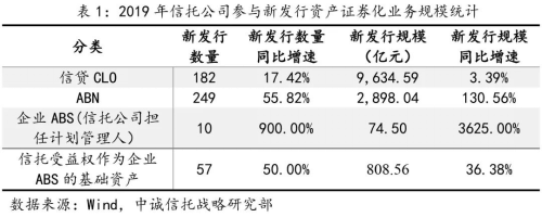 從2019年情況來看,信托公司參與的資產(chǎn)證券化業(yè)務(wù)中企業(yè)資產(chǎn)證券化業(yè)務(wù)增速更快。具體來看,新發(fā)行ABN和企業(yè)ABS增速較新發(fā)行信貸CLO更快。新發(fā)行信托資產(chǎn)證券化業(yè)務(wù)中,信貸CLO規(guī)模最大,ABN次之,信托公司擔(dān)任計(jì)劃管理人的企業(yè)ABS則剛剛起步。新發(fā)行信貸CLO規(guī)模在經(jīng)歷2017、2018年超過50%的增速后,2019年增速放緩至個(gè)位數(shù)。ABN自2016年得到監(jiān)管鼓勵(lì)以來保持高速增長(zhǎng),2016年以來新發(fā)行規(guī)模年復(fù)合增速達(dá)到159%。新發(fā)行信托公司擔(dān)任計(jì)劃管理人的企業(yè)ABS則全部由華能信托貢獻(xiàn),華能信托2018年共1單規(guī)模2億元,2019年則實(shí)現(xiàn)10單規(guī)模合計(jì)74.5億元。