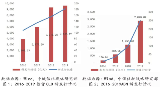 從2019年情況來看,信托公司參與新發(fā)行和存量的資產(chǎn)證券化業(yè)務(wù)規(guī)模均快速增長(zhǎng)。信托公司參與新發(fā)行的資產(chǎn)證券化業(yè)務(wù)方面,2019年,信貸CLO共182單金額合計(jì)9634.59億元;ABN共249單金額合計(jì)2898.04億元;新發(fā)行信托公司擔(dān)任計(jì)劃管理人的企業(yè)ABS共10單金額合計(jì)74.50億元;以信托受益權(quán)作為基礎(chǔ)資產(chǎn)的企業(yè)ABS共57單金額合計(jì)808.56億元。