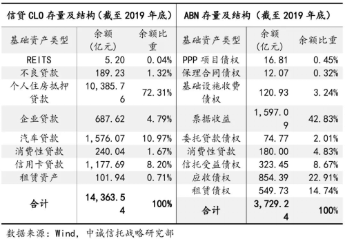 信托參與的存量資產(chǎn)證券化業(yè)務(wù)中,基礎(chǔ)資產(chǎn)結(jié)構(gòu)與新發(fā)行情況相似。根據(jù)2019年底的存量數(shù)據(jù),存量信貸CLO中,個(gè)人房貸、車貸、信用卡貸占比居于前三,個(gè)人房貸占比超過七成,三類基礎(chǔ)資產(chǎn)合計(jì)占比超過九成;存量ABN中,票據(jù)收益、應(yīng)收債權(quán)、租賃債權(quán)占比居于前三,三類基礎(chǔ)資產(chǎn)合計(jì)占比超過八成。