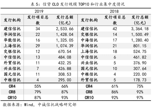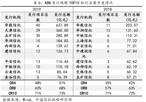 三是銀行系和央企系信托公司資產(chǎn)證券化業(yè)務(wù)展業(yè)突出。信貸CLO方面,2019年,建信信托、華潤(rùn)信托、華能信托新發(fā)行規(guī)模位居前三,其中華能信托從2018年的不足百億猛增到2019年的過千億。ABN方面,2019年,華能信托、天津信托、五礦信托新發(fā)行規(guī)模位居前三,天津信托、云南信托、金谷信托較上年新進(jìn)前十。