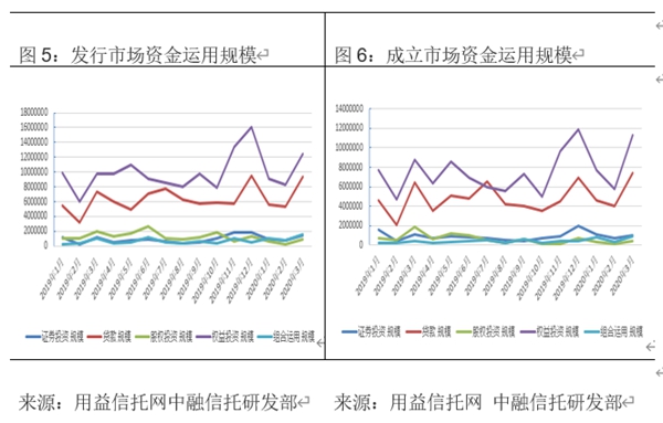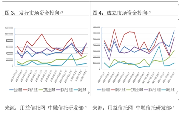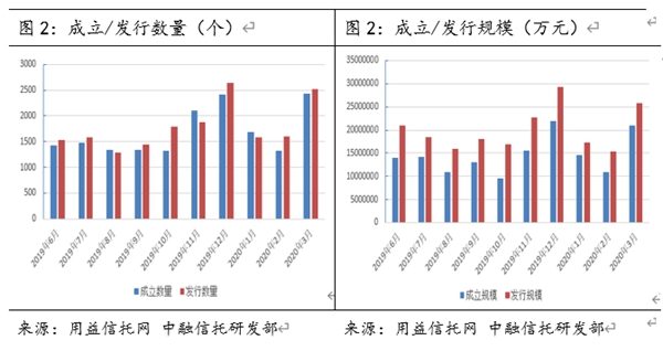 用益信托公布的數(shù)據(jù)顯示,逐步復(fù)工后,3月集合信托市場發(fā)行和成立市場出現(xiàn)強(qiáng)勢反彈。具體來看,2020年3月共有59家信托公司參與發(fā)行,56家信托公司成立產(chǎn)品。其中發(fā)行產(chǎn)品數(shù)量2512個,環(huán)比上漲57.9%,成立產(chǎn)品數(shù)量2439個,環(huán)比上漲85.8%;發(fā)行和成立產(chǎn)品規(guī)模方面同樣表現(xiàn)良好,其中發(fā)行市場規(guī)模2572.08億元,環(huán)比增長66.7%,成立市場規(guī)模2103.57億元,環(huán)比上漲92.2%。發(fā)行和成立規(guī)模在放在2019年來看,也僅低于12月,規(guī)模排在第二位。