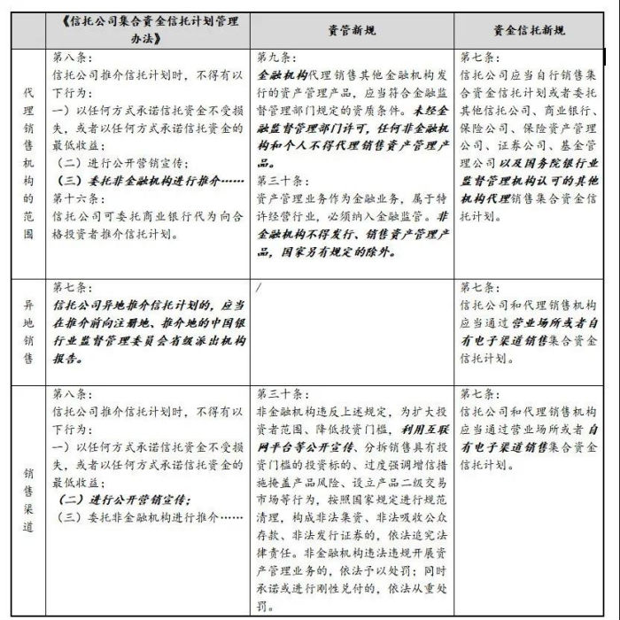 資金信托新規(guī)相對(duì)于資管新規(guī)及《信托公司集合資金信托計(jì)劃管理辦法》等規(guī)定,除再次強(qiáng)調(diào)“賣者盡責(zé),買者自負(fù)”,禁止剛兌的原則外,在資金信托推介及銷售上,主要有以下幾個(gè)方面的變化:1、留出委托非金融機(jī)構(gòu)推介的空間;2、未要求異地銷售事先報(bào)告;3、允許電子銷售渠道。